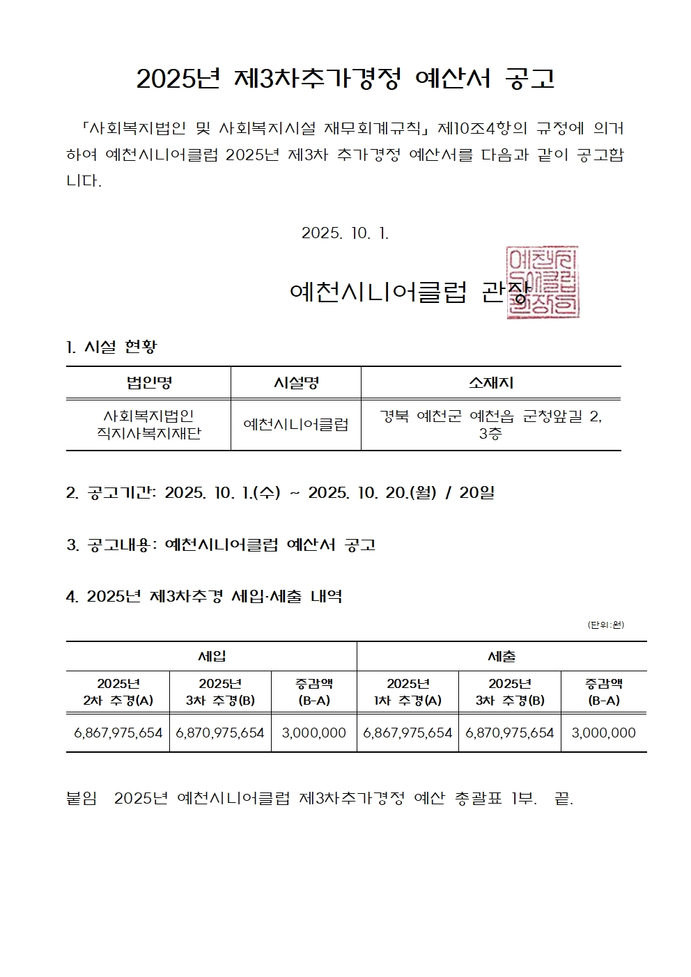 예천시니어클럽 2025년 제3차 추경예산 공고 페이지 정보 작성자 관리자 작성일25-10-01 18:53 조회41회 댓글0건 첨부파일 제3차 추경 예산 총괄표.pdf (112.3K) 2회 다운로드 DATE : 2025-10-01 18:53:32 다운로드 본문 댓글목록 등록된 댓글이 없습니다. 다음글 목록