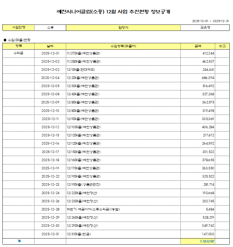 2025년 12월 예천시니어클럽(소풍) 정보공개 페이지 정보 작성자 관리자 작성일26-01-06 10:56 조회36회 댓글0건 본문 댓글목록 등록된 댓글이 없습니다. 이전글 다음글 목록