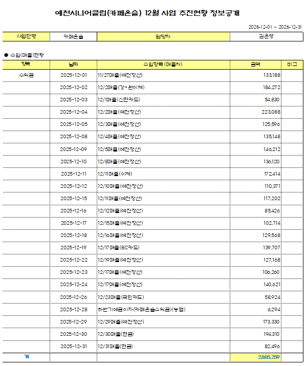 2025년 12월 예천시니어클럽(카페윤슬) 정보공개 페이지 정보 작성자 관리자 작성일26-01-06 10:56 조회45회 댓글0건 본문 댓글목록 등록된 댓글이 없습니다. 이전글 다음글 목록
