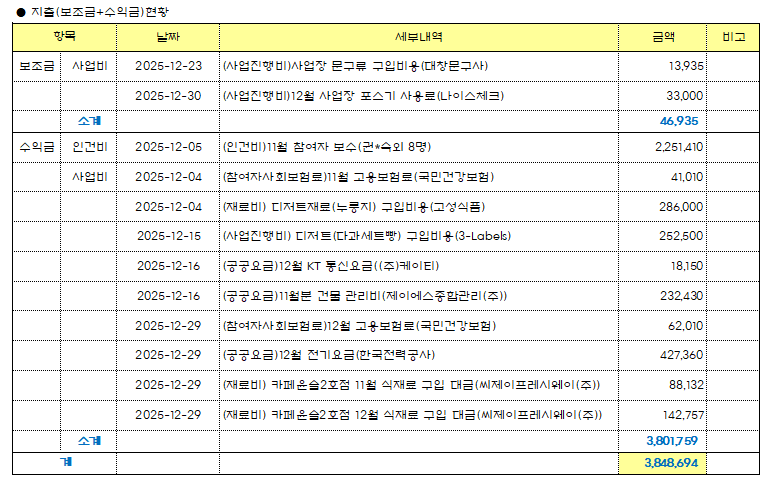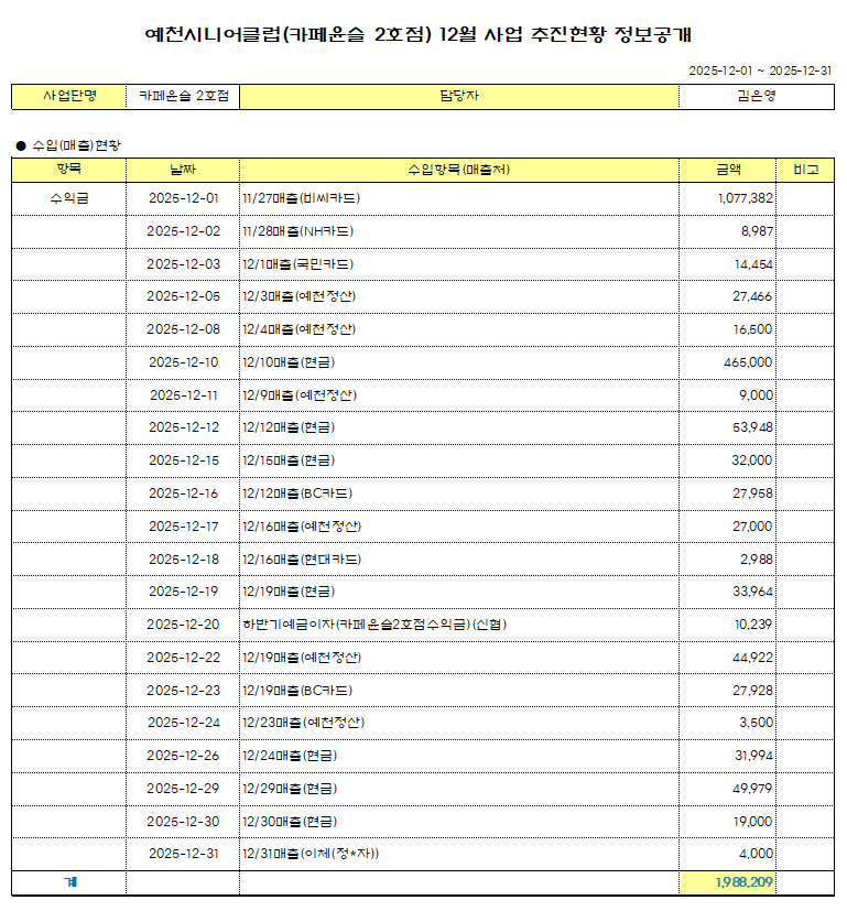 2025년 12월 예천시니어클럽(카페윤슬2호점) 정보공개 페이지 정보 작성자 관리자 작성일26-01-06 10:56 조회65회 댓글0건 본문 댓글목록 등록된 댓글이 없습니다. 이전글 다음글 목록