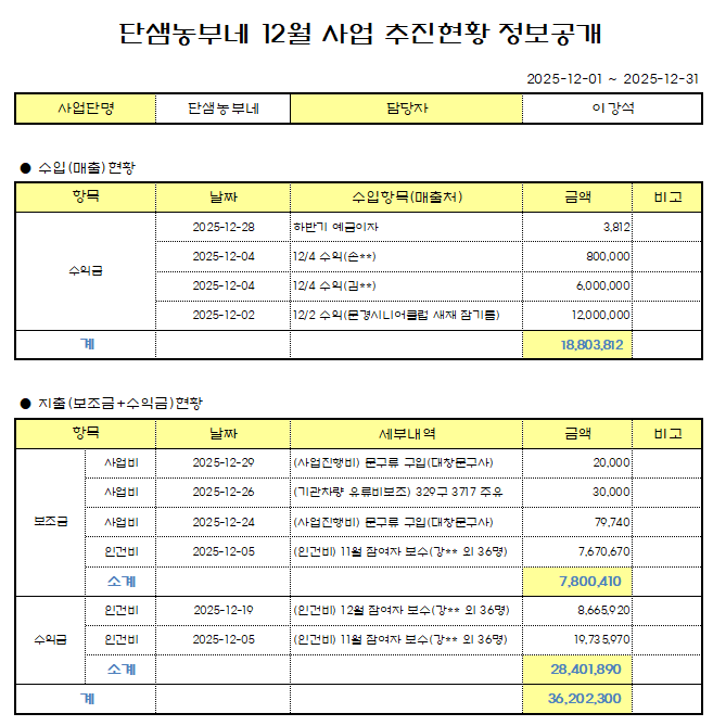 2025년 12월 예천시니어클럽(단샘농부네) 정보공개 페이지 정보 작성자 관리자 작성일26-01-06 11:05 조회98회 댓글0건 본문 댓글목록 등록된 댓글이 없습니다. 이전글 다음글 목록