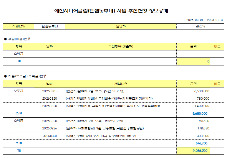2026년 3월 예천시니어클럽(단샘농부네) 정보공개 페이지 정보 작성자 관리자 작성일26-04-06 09:02 조회27회 댓글0건 본문 댓글목록 등록된 댓글이 없습니다. 이전글 다음글 목록