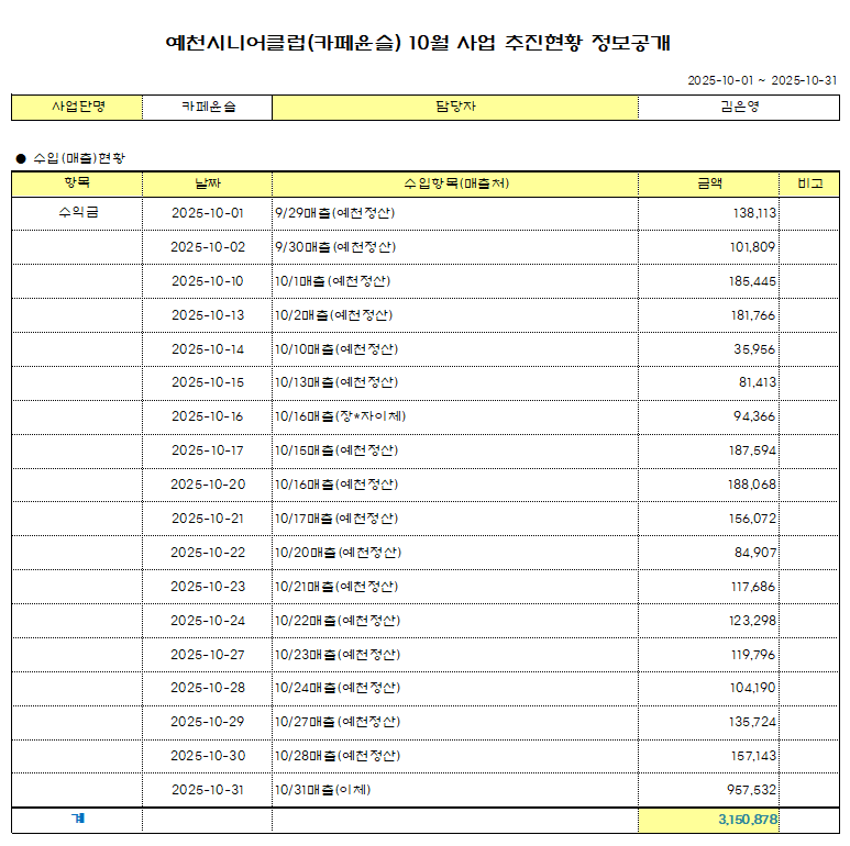 2025년 10월 예천시니어클럽(카페윤슬) 정보공개 페이지 정보 작성자 관리자 작성일25-11-05 09:52 조회3회 댓글0건 본문 댓글목록 등록된 댓글이 없습니다. 이전글 다음글 목록