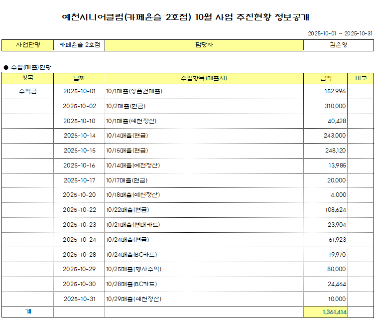 2025년 10월 예천시니어클럽(카페윤슬2호점 정보공개) 페이지 정보 작성자 관리자 작성일25-11-05 09:52 조회4회 댓글0건 본문 댓글목록 등록된 댓글이 없습니다. 이전글 다음글 목록
