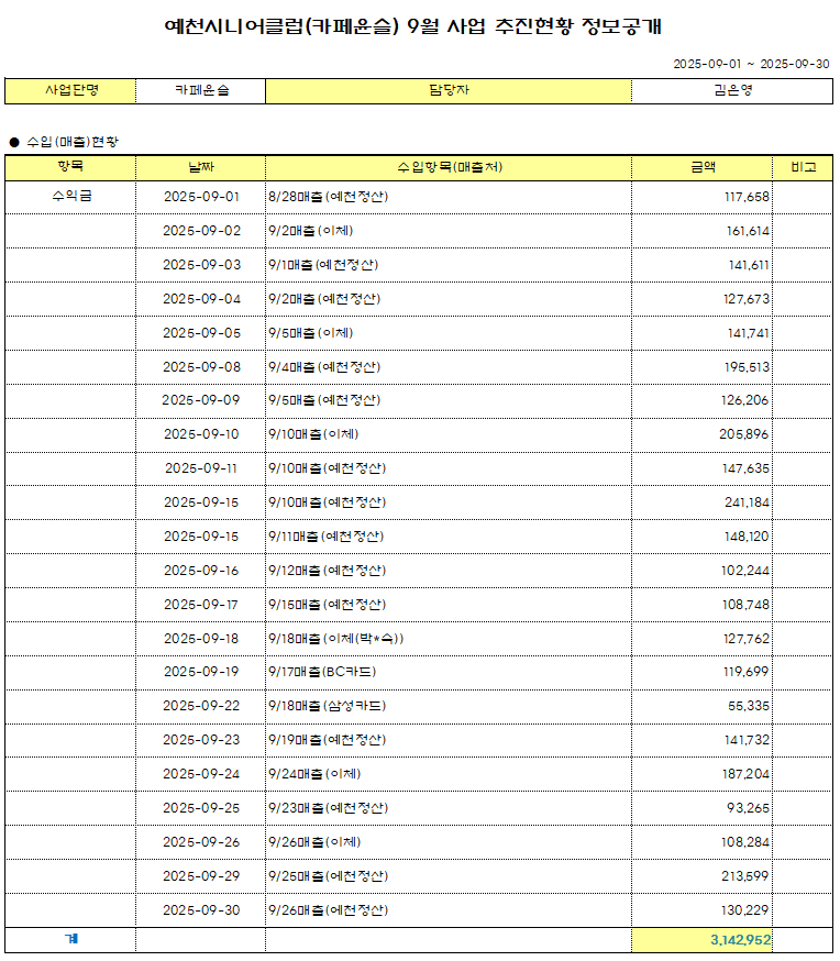 2025년 09월 예천시니어클럽(카페윤슬) 정보공개 페이지 정보 작성자 관리자 작성일25-10-10 13:37 조회105회 댓글0건 본문 1 댓글목록 등록된 댓글이 없습니다. 이전글 다음글 목록