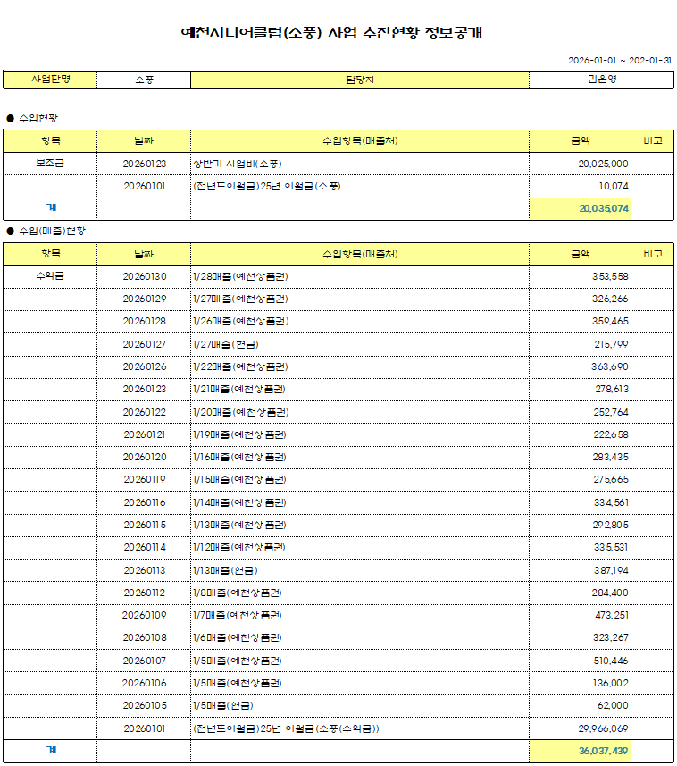 2026년 1월 예천시니어클럽(소풍) 정보공개 페이지 정보 작성자 관리자 작성일26-02-19 09:37 조회50회 댓글0건 본문 댓글목록 등록된 댓글이 없습니다. 이전글 다음글 목록