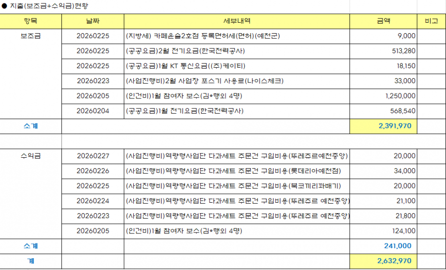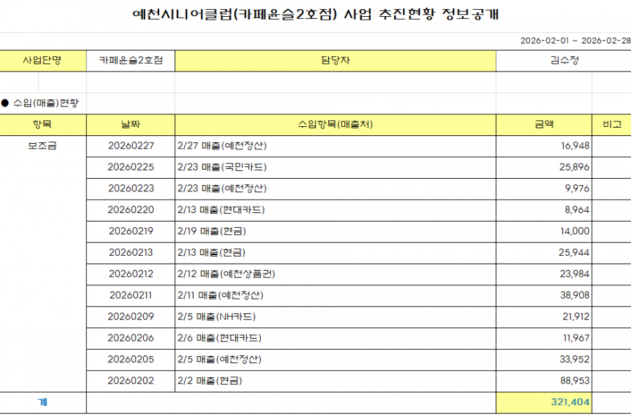 2026년 2월 예천시니어클럽(카페윤슬 2호점) 정보공개 페이지 정보 작성자 관리자 작성일26-03-11 10:11 조회45회 댓글0건 본문 댓글목록 등록된 댓글이 없습니다. 이전글 다음글 목록